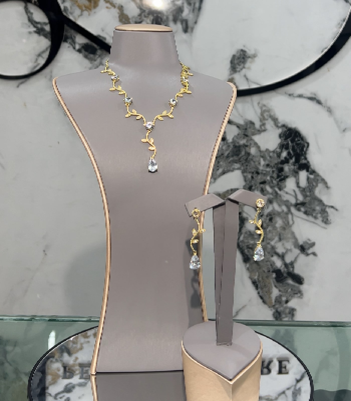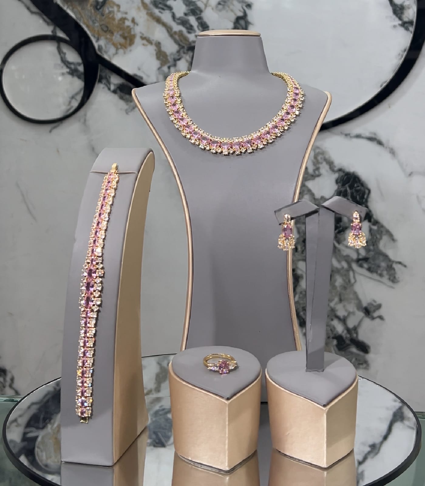 A timeless jewellery set featuring a matching necklace, earrings, and bracelet.