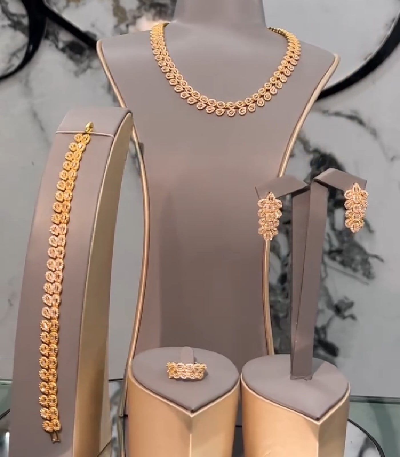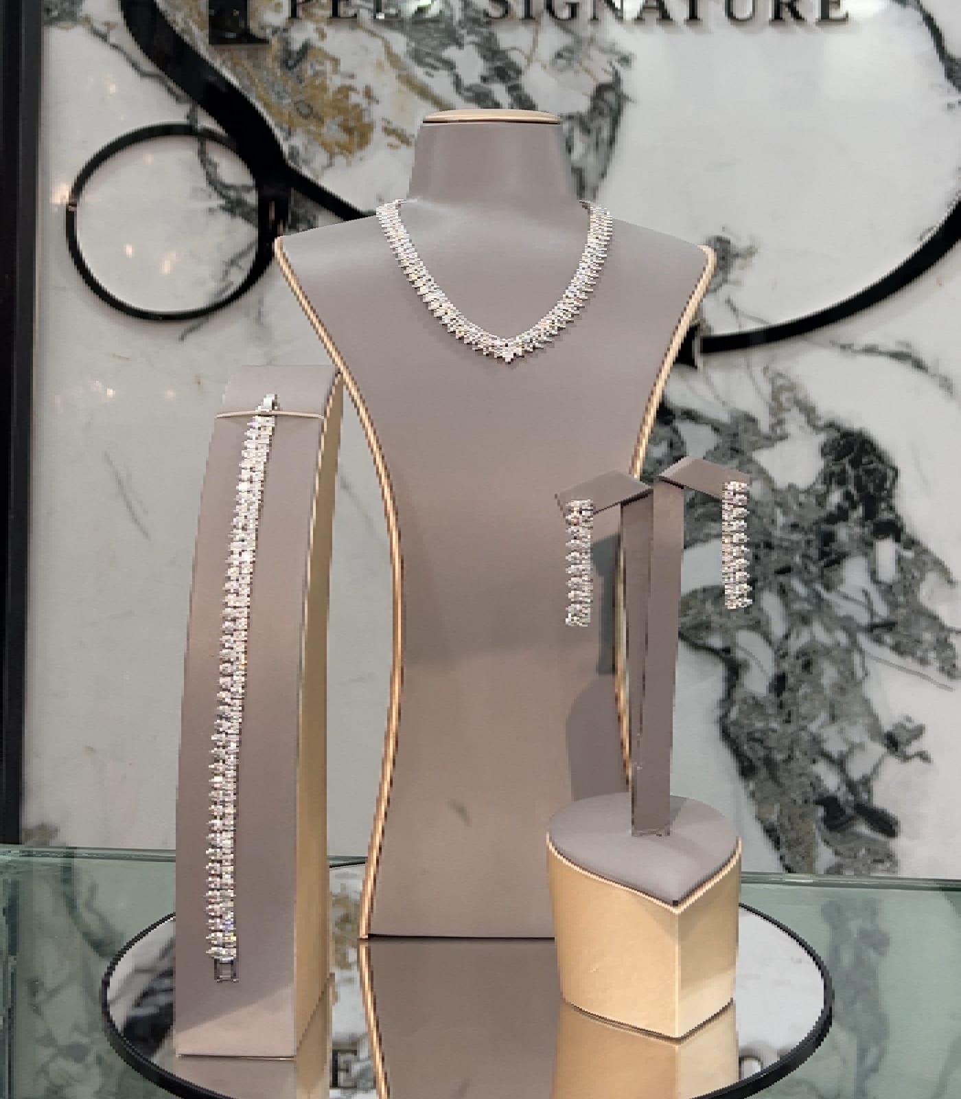 A timeless jewellery set featuring a matching necklace, earrings, and bracelet.